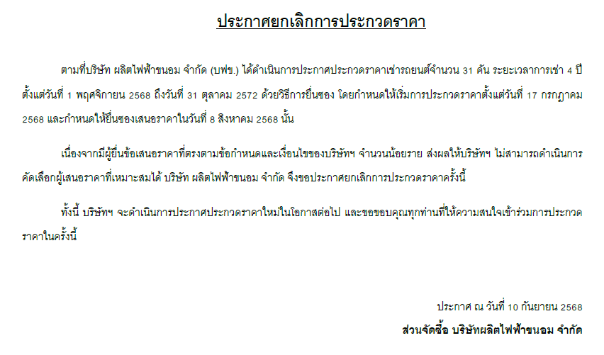 บริษัท ผลิตไฟฟ้าขนอม จำกัด ประกาศยกเลิกประกวดราคาเช่ารถยนต์ จำนวน 31 คัน